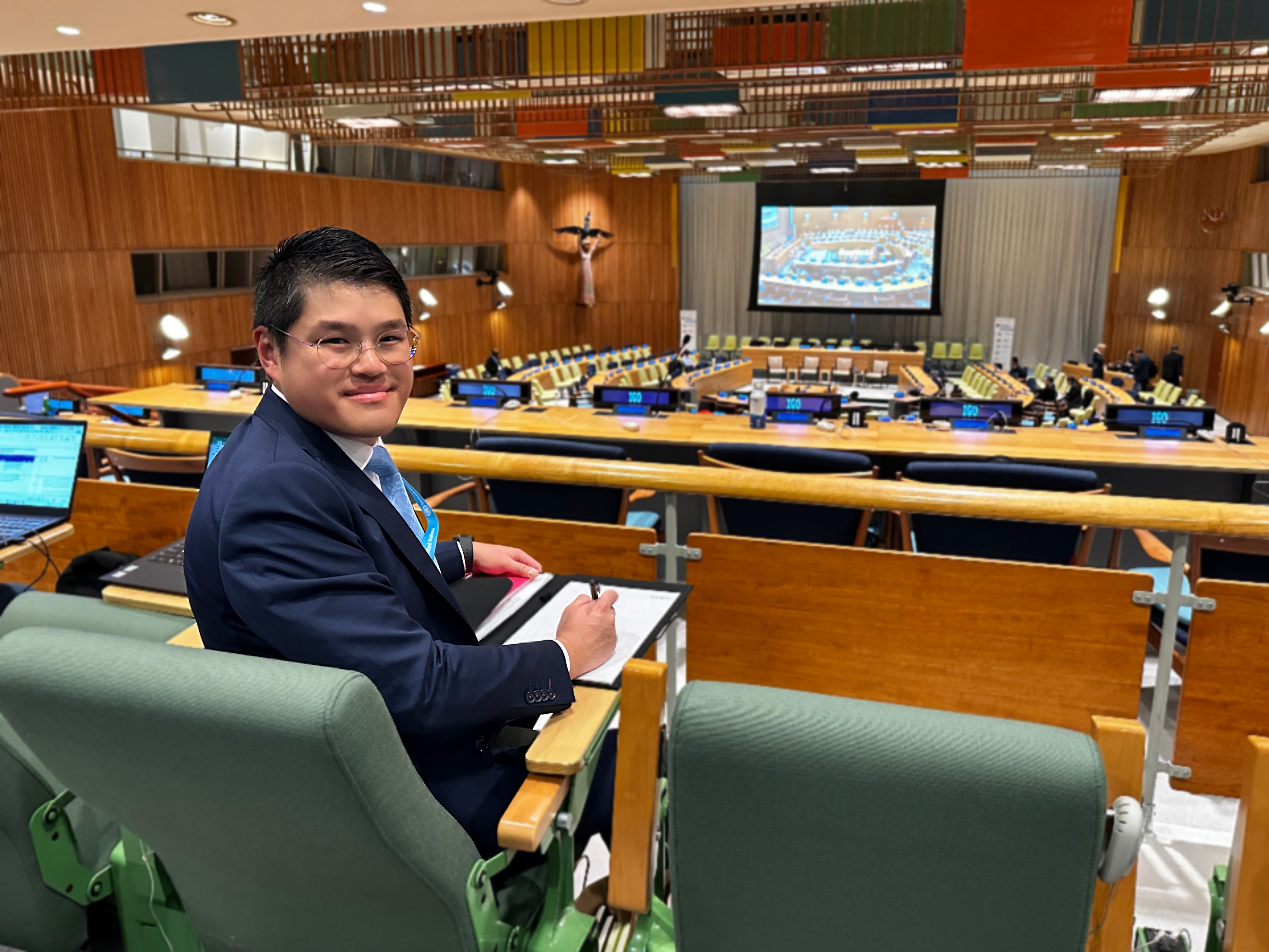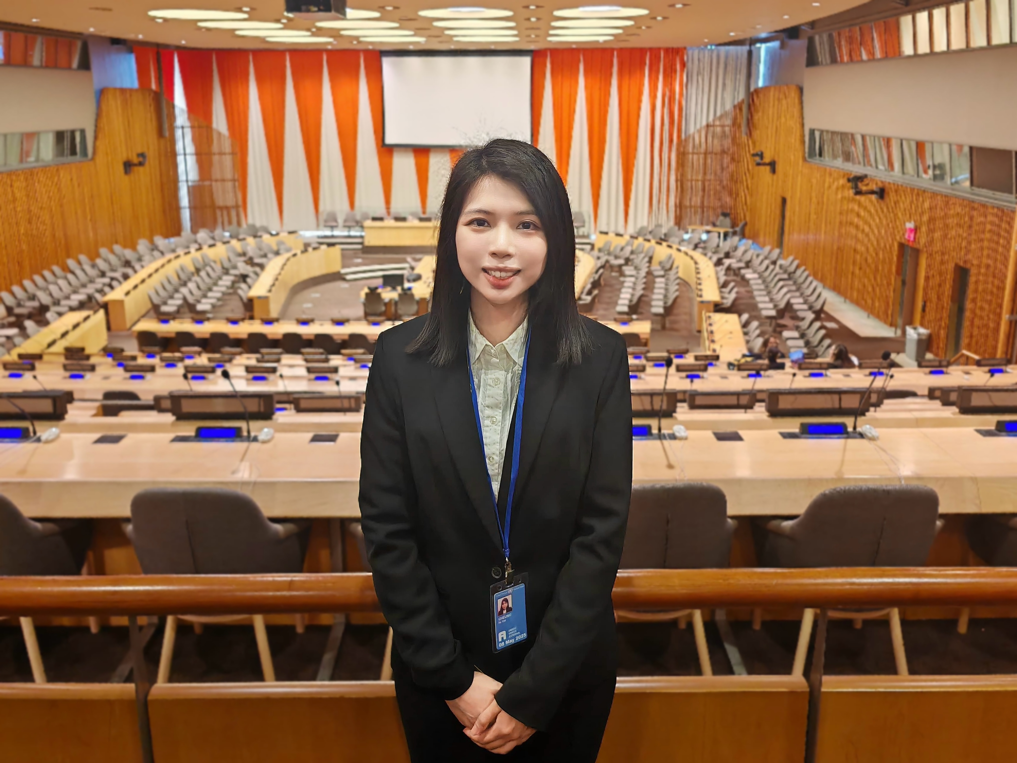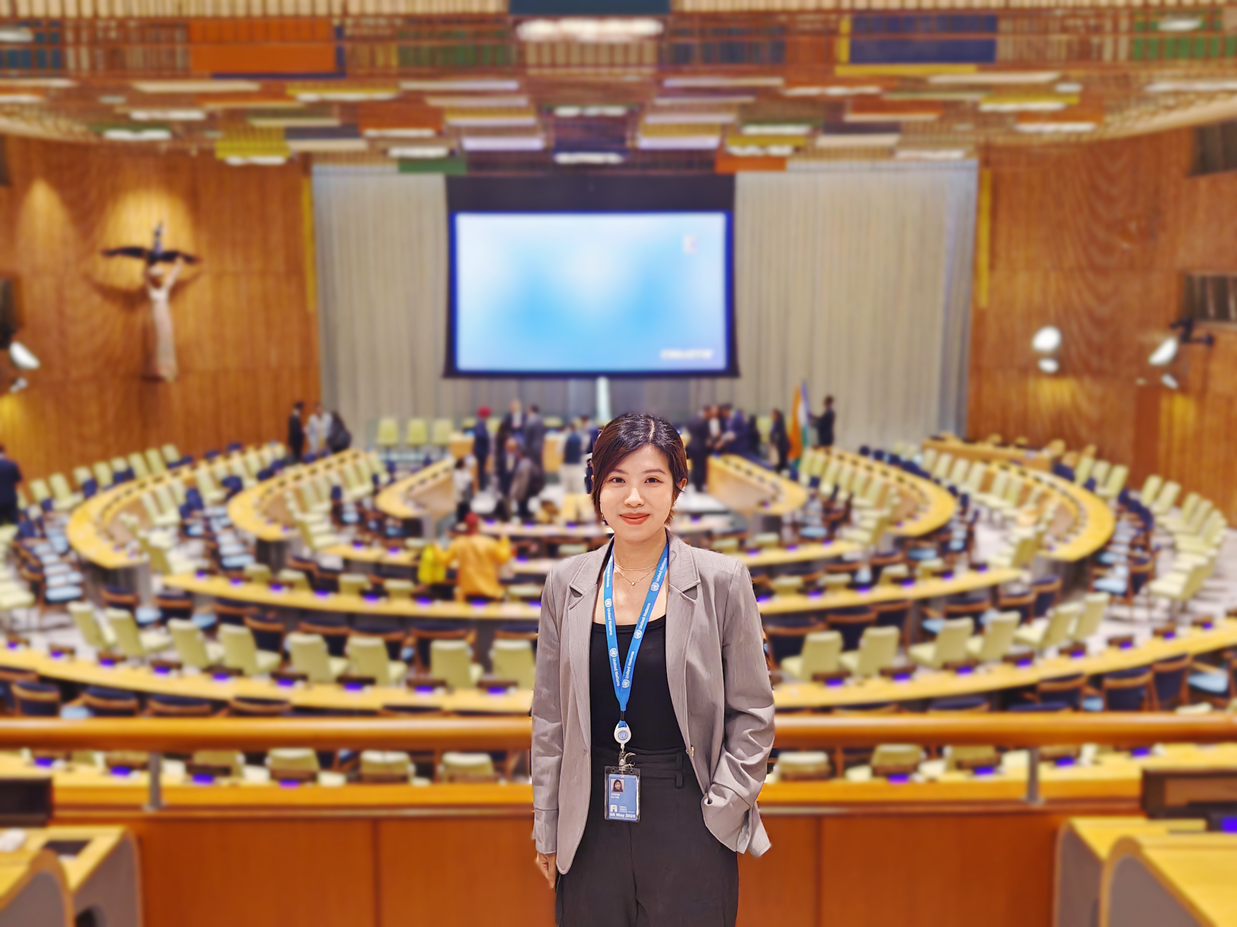 The photo shows Cindy at the Economic and Social Council Chamber in the UN Building.