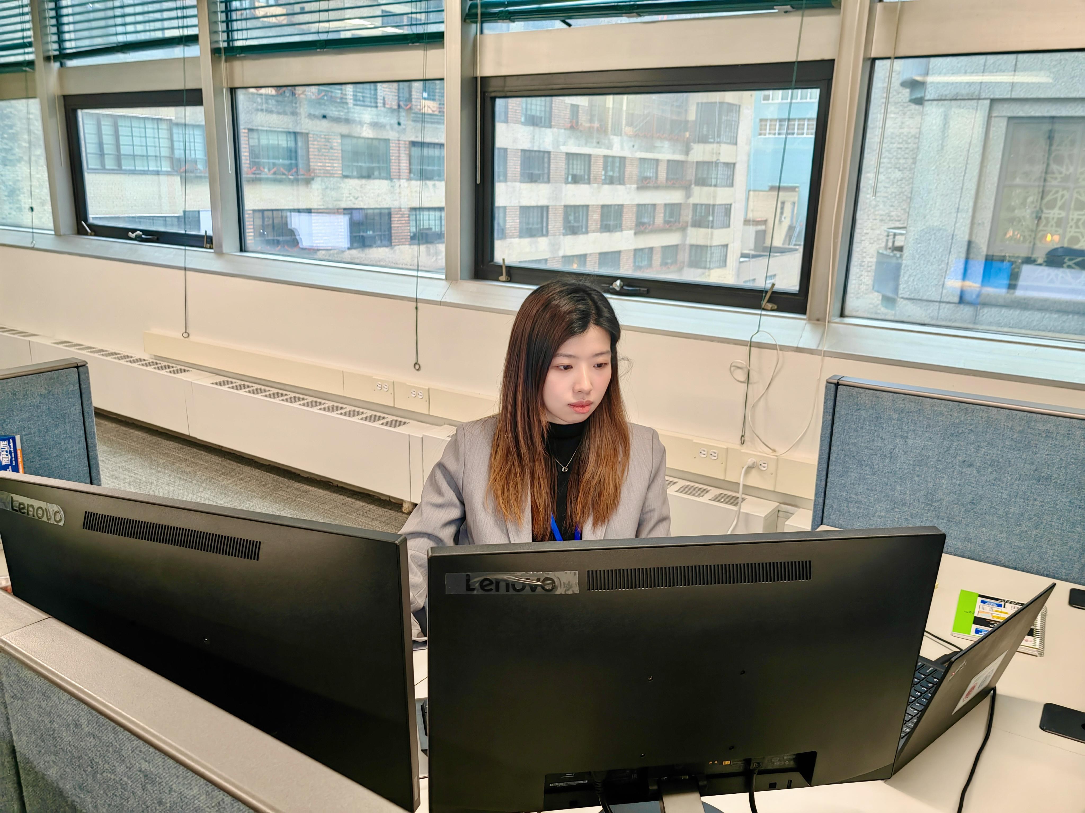 The photo shows Angel working in the office of the UN audit team.