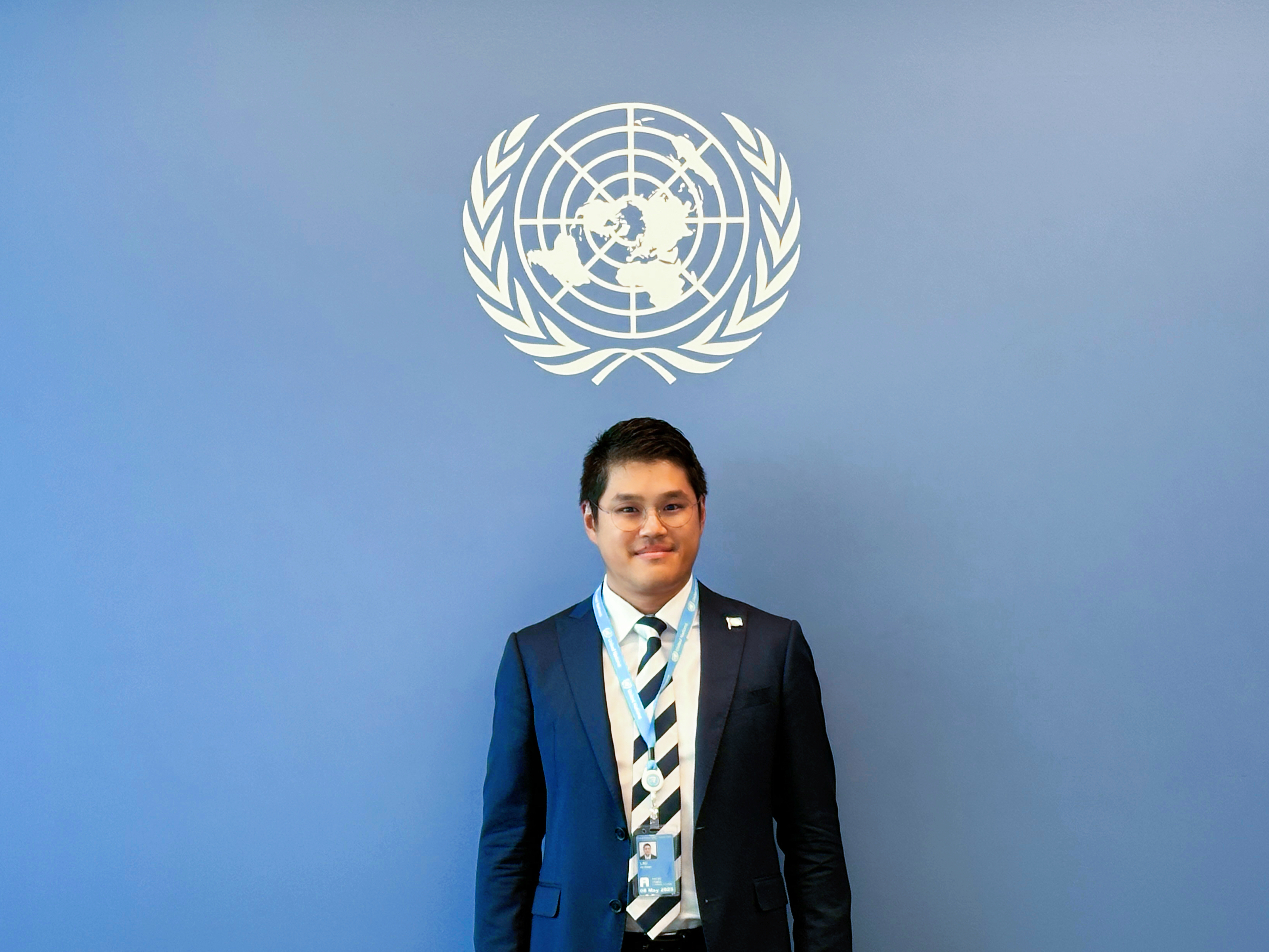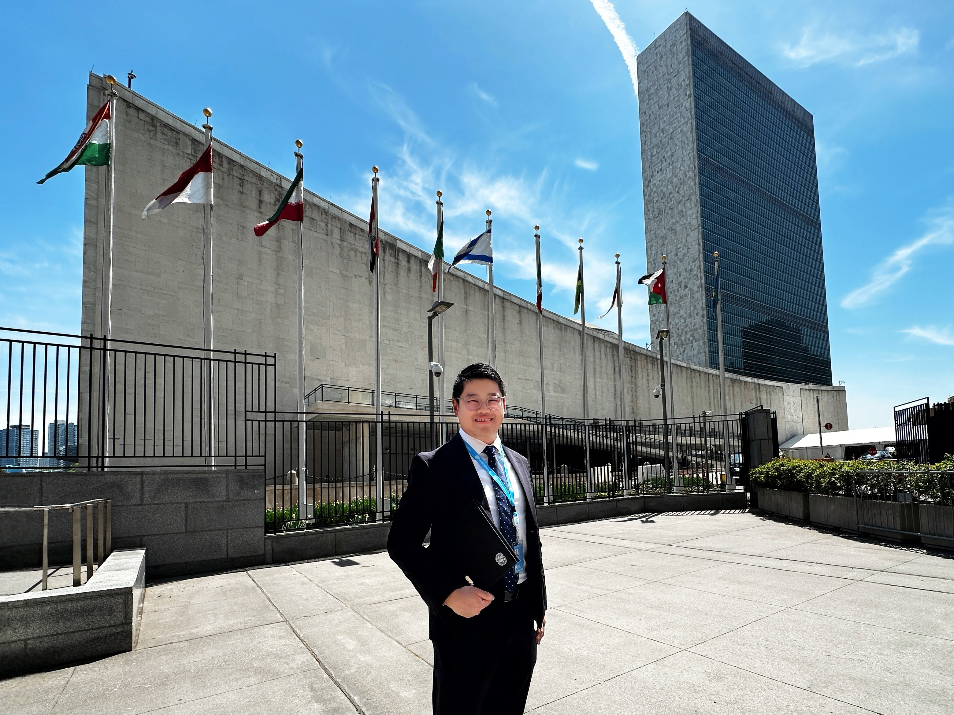 The photo shows Louis in front of the UN Headquarters Building in New York.